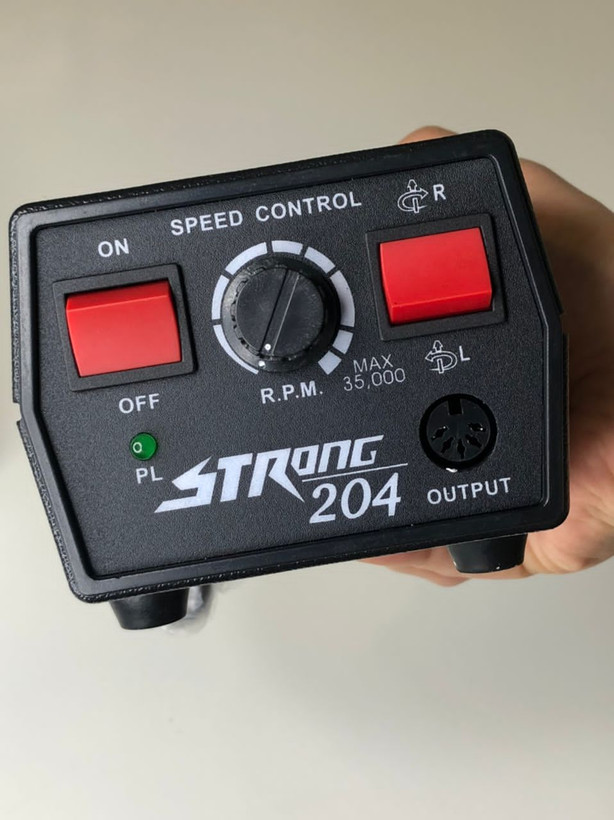 پدال پایی که در دستگاه های سوهان برقی استرانگ 204 مشاهده می شود پدالی با ابعاد کوچک و مناسب و کیفیت ساخت مطلوب می باشد. پدال این دستگاه تنها قابلیت قطع و وصل دستگاه را داشته و دور موتور توسط دیمر تنظیم می گردد. در کار های آرایشی نظیر کاشت ناخن استفاده از پدال پایی متداول نبوده و معمولا هنرمندان رشته کاشت ناخن تنها از دیمر دستی دستگاه استفاده می نمایند